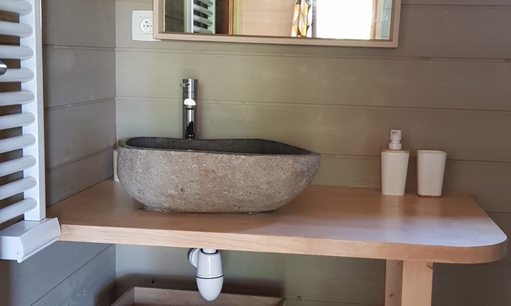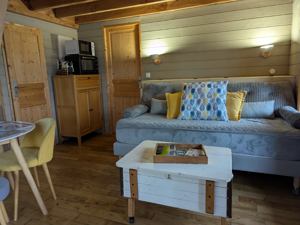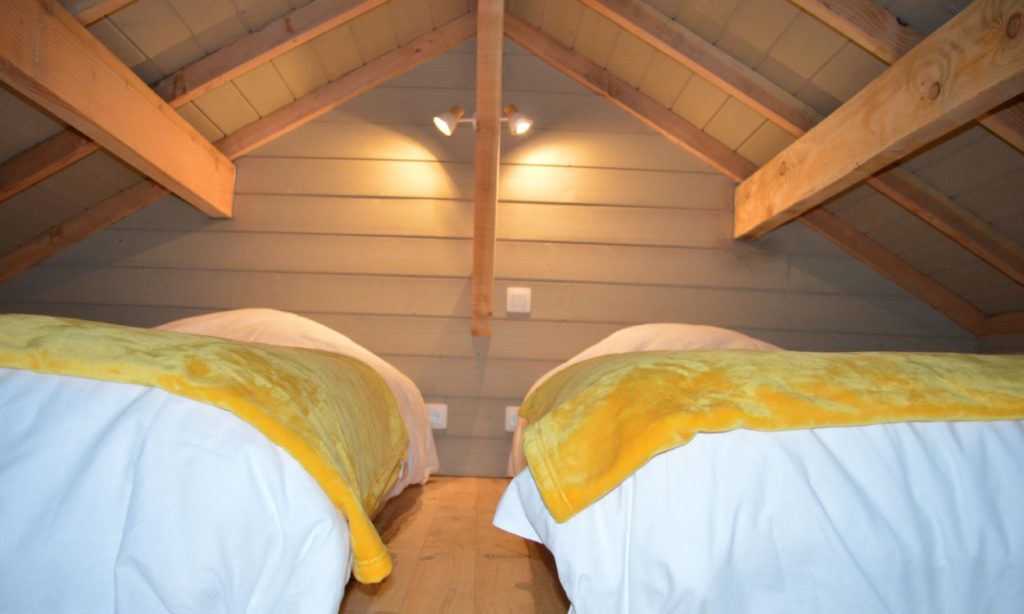 Envie de prendre de la hauteur ? Une échelle vous mène à la mezzanine où deux lits simples (90x190) viennent compléter ce cocon, idéal pour un séjour en couple ou en famille (jusqu’à 4 personnes).